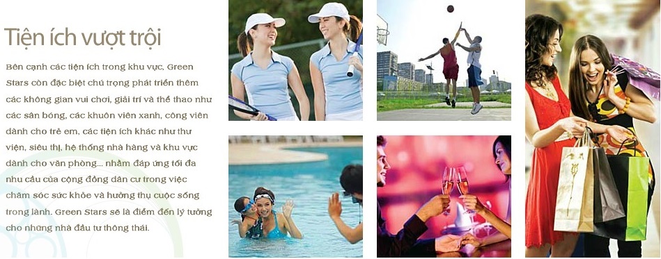 Chung cư Green Stars được thừa hưởng các tiện ích của Khu đô thị Thành Phố Giao lưu với điểm nhấn là hồ điều hòa diện tích 18 ha, thiết kế thác nước, mê cung, công viên cây xanh, bể bơi, tạo nên một không gian thoáng mát và làm dịu đi những ngày hè nóng bức các cư dân tại dự án.