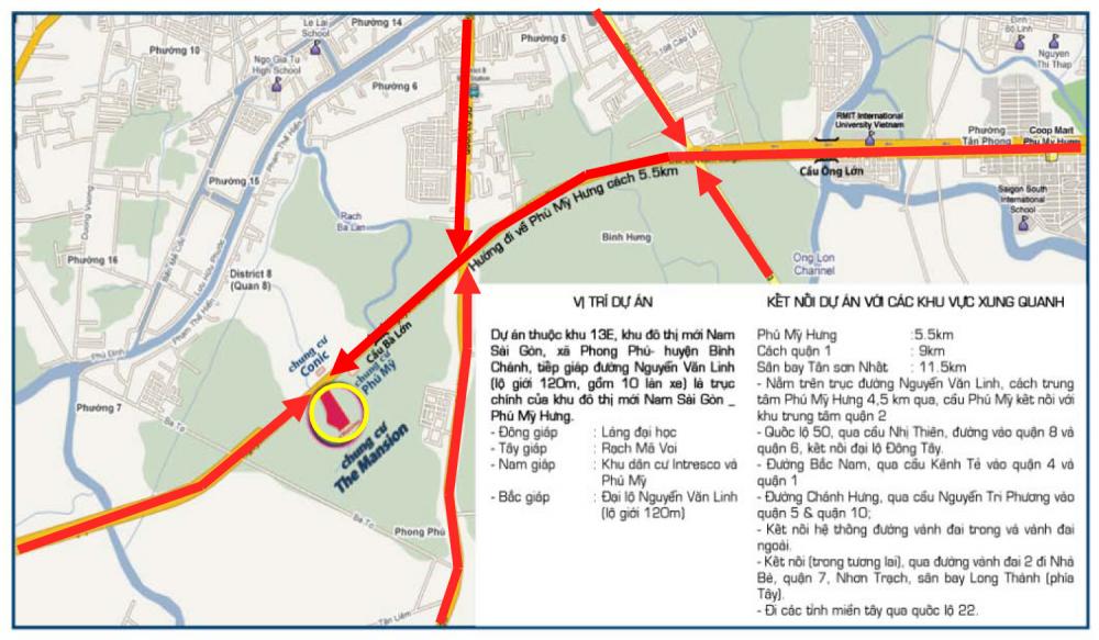Chung cư The Mansion nằm tại lô 13E, đường Nguyễn Văn Linh, xã Phong Phú, Bình Chánh, Tp.HCM. Từ căn hộ The Mansion, bạncó thể dễ dàng di chuyển vào trung tâm thành phố theo trục đường Nguyễn Văn Linh - Huỳnh Tấn Phát - Nguyễn Tất Thành hoặc sang quận 5, quận 6 và quận 8 bằng hàng loạt tuyến giao thông khác nhau… Nếu nhìn tổng thể trong khu đô thị Nam Sài Gòn, có thể nhận thấy dự án The Mansion nằm ở vị trí trung tâm, gần với các khu dân cư mới và hiện đại như Phú Mỹ Hưng, Conic,…
