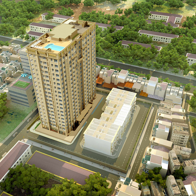 Khu cao tầng có diện tích khu đất 2.049m2. Tổng diện tích sàn sử dụng (không bao gồm tầng hầm và tầng kỹ thuật) là 24.210m2. Tòa nhà cao 19 tầng và 2 tầng hầm. Hai tầng hầm là bãi đậu xe diện tích đến gần 4.000m2 đáp ứng hoàn toàn nhu cầu của dân cư tòa nhà cao tầng, khu nhà liên kế thấp tầng cũng như khách mua sắm. Tầng 1 là sảnh chờ của tòa nhà, các cửa hàng bán lẻ, bộ phận bảo vệ, phòng đặt tủ thư, báo của các căn hộ, phòng sinh hoạt cộng đồng. Tầng 2-19 là căn hộ cao cấp và Penthouse. Tầng mái dùng làm phòng đa năng, các phòng dịch vụ, phòng tập, bể bơi.