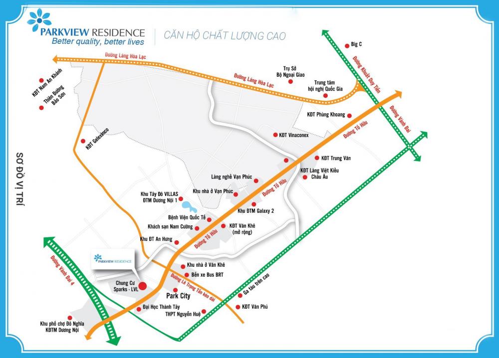 Chung cư Park View Residence thuộc khu vực có tốc độ đô thị hóa nhanh nhất của TP. Hà Nội với nhiều công trình quy mô lớn như Trung tâm Hội nghị Quốc gia, Trung tâm Thể thao Quốc gia, các khách sạn 5 sao, cao ốc văn phòng, siêu thị Big C,...