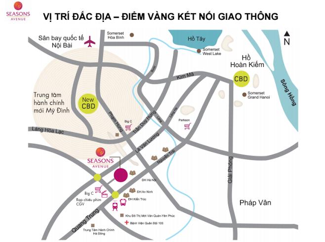 Chung cư Seasons Avenue tọa lạc trong quần thể khu đô thị mới liền kề vớiLàng Việt Kiều Châu Âu, khu Trung Văn. Dự án nằm rất gần tuyến xe buýt có rất nhiều điểm hướng tâm, tuyến đường sắt trên cao (Sky Train), hệ thống đường bộ hoàn chỉnh không gây tắc đường