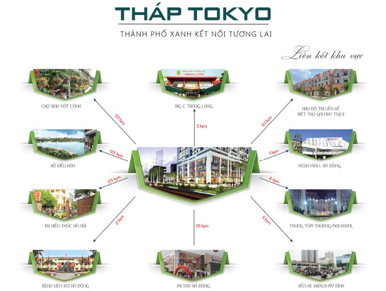 Tokyo Tower nằm gần nhiều trường học, siêu thị nhưĐại học Khoa học Xã hội và Nhân văn, Đại học Hà Nội, Đại học Kiến Trúc, Học viện Bưu chính Viễn thông, Học viện An Ninh,Media mart,SapoMart, Trần Anh, siêu thị điện máy Sài Gòn Nguyễn Kim, siêu thị Co.opmart...