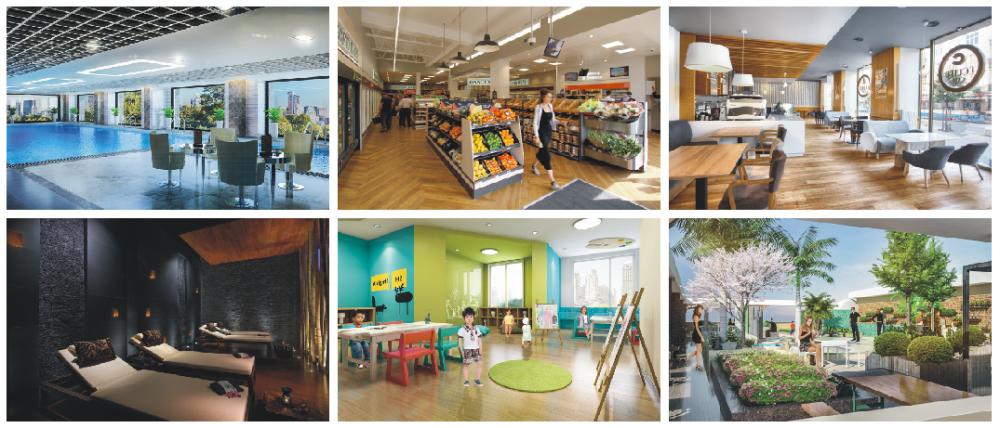 - Trung tâm thương mại dịch vụ, diện tích gần 2.400m2 đặt ngay tại tầng 1-2 của tòa nhà với hệ thống các chuỗi cửa hàng tiện ích, khu vui chơi & chăm sóc sức khỏe,phòng tập gym, spa, bể bơi,… được bố trí hợp lý, đáp ứng mọi nhu cầu của cư dân