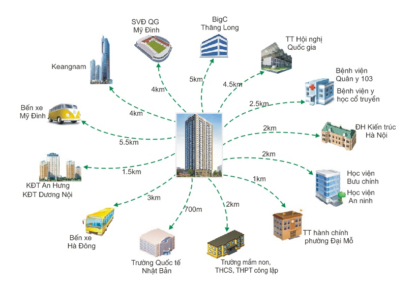 - Cách sân vận động quốc gia Mỹ Đình 4km,Trung tâm hội nghị Quốc Gia 4,5km, Keangnam 4km, Big C Thăng Long 5km…