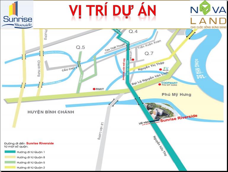 Chung cư Sunrise Riverside tọa lạc trên tuyến đường huyết mạch Nguyễn Hữu Thọ của khu đô thị mới quận 7 nối liền với Phú Mỹ Hưng. Dự án Sunrise City View bảo đảm sự thuận tiện tối ưu trong hoạt động kết nối giao thông. Từ đây, cư dânchỉ mất 10 phút tới ngay chợ Bến Thành, 3 phút tới ngay Phú Mỹ Hưng cũng như những quận trung tâm như quận 5, 4, 8, 10 .