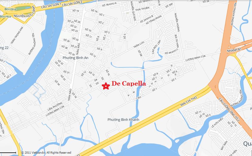 Chung cư De Capella tọa lạc trên Phố Lương Định Của, Phường An Phú, Quận 2, Tp.HCM. Dự án sở hữuvị trí đắc địa ngay trung tâm quận 2 nêntừ đây, bạncó thể dễ dàng di chuyển về khu An Phú An Khánh, Khu đô thị Thủ Thiêm, quận Bình Thạnh, trung tâm quận 1 và quận 9.