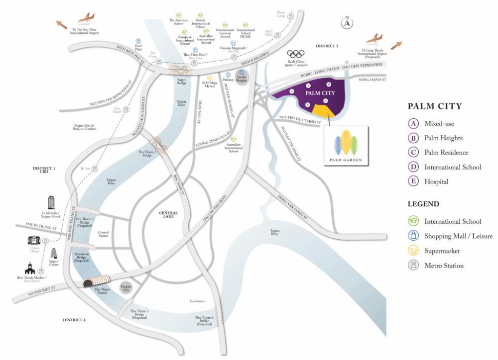 Bên cạnh đó,Quận 2 hiện đang đảm nhận chức năng trở thành khu tài chính trọng tâm của cả nước, nơi tập trung các doanh nghiệp, tập đoàn lớn tromg lĩnh vực tài chính - kinh tếvàlà quận trung tâm mới sau Quận 1. Ngoài ra, Tp.HCM đã và đangtriển khai hàng loạtdự án mang tầm cỡ quốc gia và quốc tế tại Quận 2 nênPalm Garden theo đó cũng được hưởng nhiều thuận lợi về hạ tầng - kết nối giao thông và giá trị BĐS: