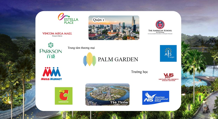 Không chỉ sở hữu những tiện ích kể trên, với việc tiếp giáp rất gần cụm trung tâm thương mại, khu dân cư hiện hữu sầm uất nhất nhì quận 2,Palm Garden còn đem lại hàng loạt tiện ích - dịch vụ hiện đại khác cho cuộc sống hoàn mỹ của các cư dân: