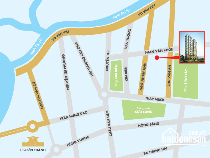 - Cách các khu chợ đầu mối lớn của Tp.HCM chỉ 1 phút đi bộ: chợ Kim Biên, Chợ Bình Tây, Chợ Soái Kình Lâm.... Và đến với Trung tâm mua sắm Parkson Hùng Vương chỉ mất 5 phút.
