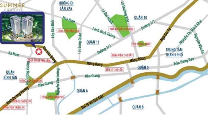Căn hộ Summer Square nằm tại số 243 đường Tân Hòa Đông, phường 14, quận 6, Tp.HCM. Dự án tọa lạc ngay mặt tiền đường huyết mạch nối quận Bình Tân và quận 6 và các tỉnh miền Tây. Đặc biệt, Tân Hòa Đông là một trong các trục đường thương mại, giao thông chính của quận 6. Bên cạnh đó, căn hộ Summer Square còn nằm gần vòng xoay Phú Lâm, đây là nút giao thông tỏa đi nhiều hướng trên địa bàn thành phố.
