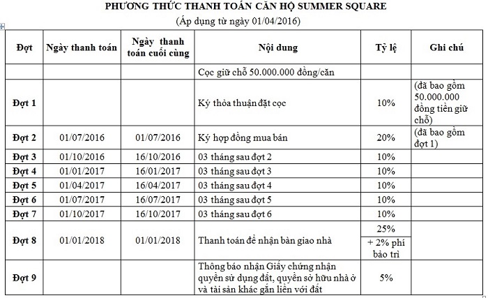 Tiến độ thanh toán căn hộ Summer Square Mẫu 2