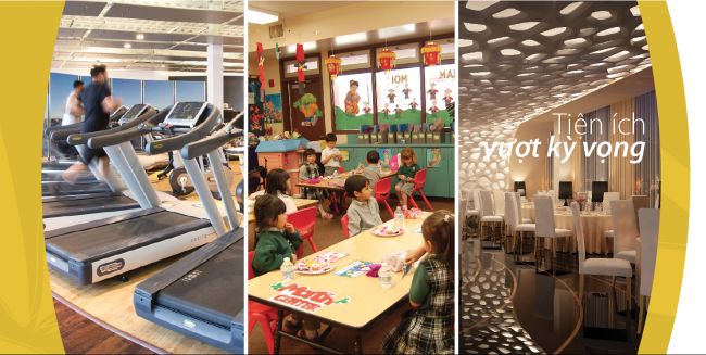 Từ tầng 3 có thang bộ lên hồ bơi tầng 4 với diện tích 132m2 cho người lớn và 28m2 cho trẻ em, kế bên hồ bơi là phòng tập thể dục diện tích 75m2. Tầng 4 – tầng 6 có hành lang lộ thiên bắc sang khối kiến trúc 6 tầng hướng Bắc
