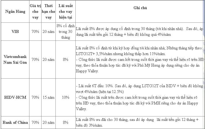 Dự án căn hộ Happy Valley hợp tác với hơn 15 ngân hàng để thực hiện chương trình cho vay mua căn hộ tại dự án với mức vay lên đến 70% giá trị căn hộ, trong thời hạn tối đa là 25 năm.