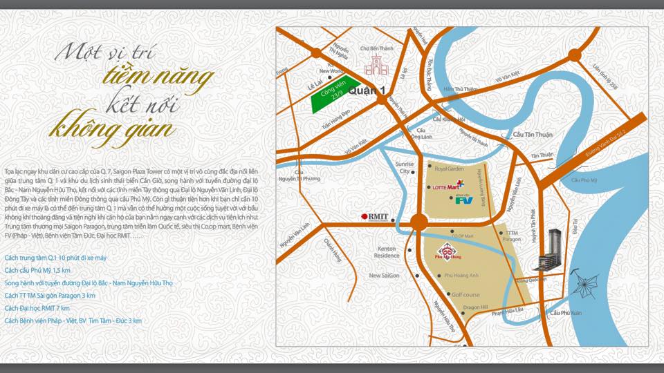Saigon Plaza Towercó quy mô28 tầng cao, tọa lạctại trung tâm quận 7, Tp.HCM. Nằm ngay mặt tiền Huỳnh Tấn Phát, cung đường chính nối giữa Sài Gòn và Cần Giờ - trung tâm dự trữ sinh quyển thế giới, chỉ cần vài phút, cư dân đã có mặt giữa Phú Mỹ Hưng – trái tim của khu Nam Sài Gòn với cực nhiều tiện ích sánh tầm các nước phát triển nhất khu vực Đông Nam Á.