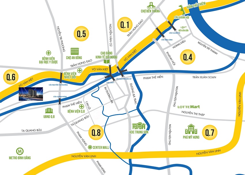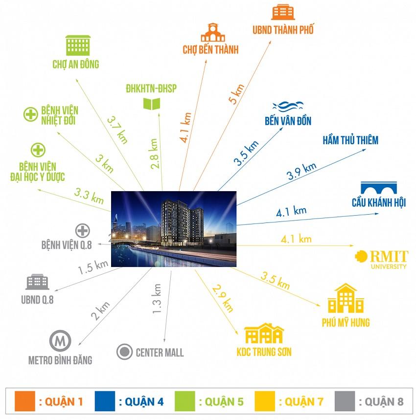 Felisa Riverside Quận 8 nằm ở số 99 Bến Bình Đông, phường 11, quận 8, Tp.HCM. Dự án nằm sát bên chợ Xóm Củi quận 8, gần trường học, bệnh viện, trung tâm thương mại, cách Đại lộ Võ Văn Kiệt 200m, trung tâm Chợ Lớn 500m, hướng nhìn trung tâm thành phố và sông Sài Gòn.