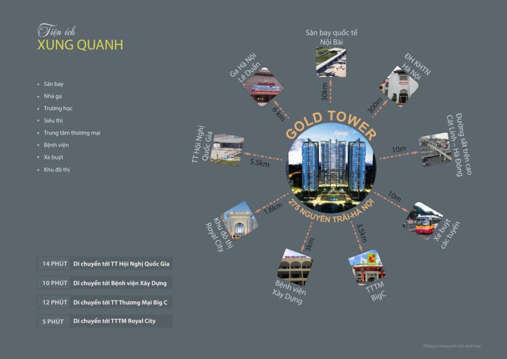 Gold Tower tọa lạc tại số 275 Nguyễn Trãi, quận Thanh Xuân, TP. Hà Nội - một vị trí thuận lợi vềgiao thông và sở hữu hạ tầng đồng bộ, hoàn thiện. Từ đây, cư dân dự án có thể di chuyển đến các quận huyện nội thành cũng như các huyện thị lân cận một cách nhanh chóng: