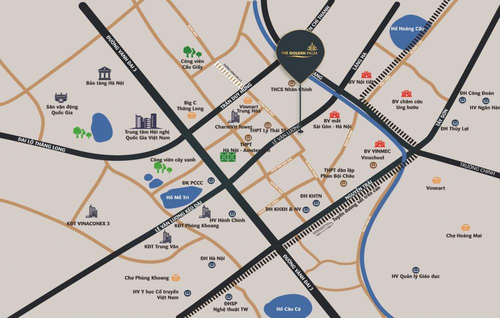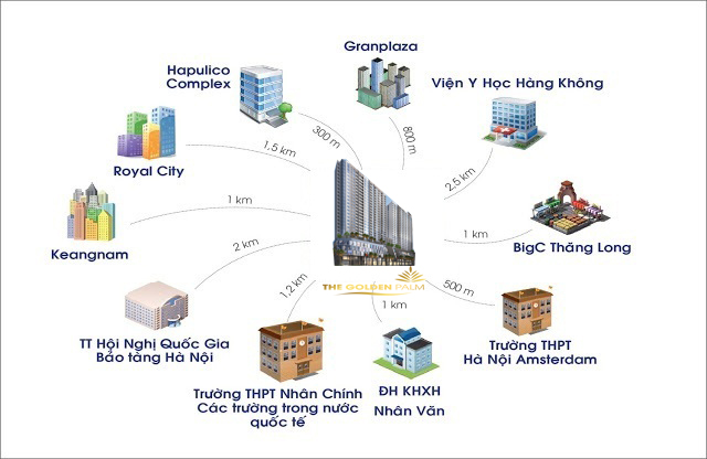 Từ dự án The Golden Palm Lê Văn Lương,trong vòng bán kính 500m là hệ thống nhiềungân hàng, siêu thị, mua sắm, trung tâm y tế, trường học,... nằmtiếp giáp vớicác khu đô thị mới phát triển, hạ tầng đồng bộ như The Manor,Trung Yên, Trung Hòa - Nhân Chính,...