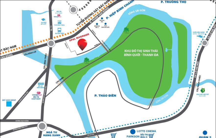 Căn hộ Opal Riverside nằm bêncạnh sông Sài Gòn, cách cầu Bình Triệu chỉ 1km. Từ chân cầu Bình Triệu bạn có thểdi chuyển theo tuyến đường Bình Lợi - Tân Sơn Nhất khoảng 1km. Cư dân sinh sống tại Opal Riverside sẽ dễ dàng khi di chuyển về các quận như quận 2, quận Bình Thạnh, quận Phú Nhuận, quận Tân Bình, quận Gò Vấp thông qua tuyến đường Bình Lợi - Tân Sơn Nhất.