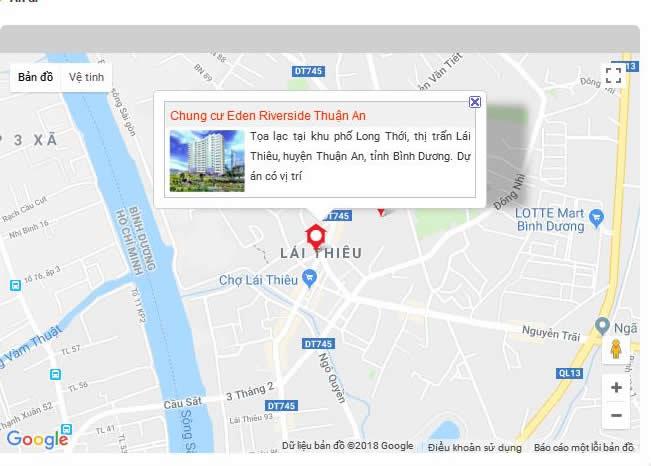 Eden Riverside nằm ngay khu phố Long Thới, thị trấn Lái Thiêu, huyện Thuận An, tỉnh Bình Dương,cách trung tâm thị trấn Lái Thiêu 500m vàtrung tâm hành chính tỉnh Bình Dương 9 km.