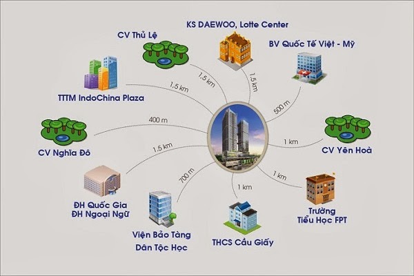 - Khoảng lùi công trình so với đường Cầu Giấy là 9m với khối đế, 15m với khối tháp cao tầng