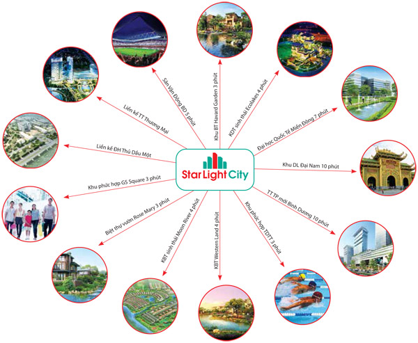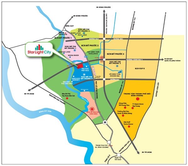 Phố thương mại StarLight City tọa lạctại phường Thới Hòa, thị xã Bến Cát, cách trung tâm thành phố Mới Bình Dương chỉ trong vòng 10 phút di chuyển. Với vị trí giàu tiềm năng khai thác thương mại, quy hoạch đẹp và xây dựng đồng bộ theo tiêu chuẩn của Singapore, StarLight City hứa hẹn sẽ là điểm đến lý tưởng cho các nhà đầu tư.