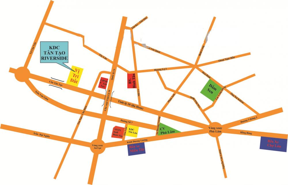 Tân Tạo Riversidetọa lạc trên mặt tiền đường Tỉnh Lộ 10, phường Tân Tạo, quận Bình Tân, Tp.HCM. Dự án sở hữu vị trí thuận lợi ngay giữa KDC sầm uất, liền kề các tuyến đường giao thông huyết mạch và các khu công nghiệp danh tiếng. Từ đây, bạn và gia đình có thể di chuyển nhanh chóng về các tỉnh thành lận cận như Bình Dương, Đồng Nai, Bà Rịa - Vũng Tàu, các tỉnh miền Tâythông quatuyến Metro số 3A - Bến Thành - Huyện Bình Chánh, đường vanh đai 3-4.