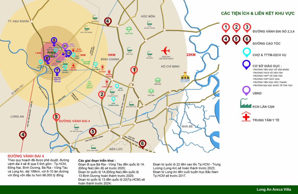 Khu dân cư Long An Areca Villa nằm trên tuyến đường chính (34m), ngay trung tâm thị trấn Đức Hòa, Long An. Đây là nơi giao thương mua bán hàng hóa nhộn nhịp, kết nối giao thông thuận lợi đi về trung tâm Bến Lức, Hóc Môn, Tây Ninh.