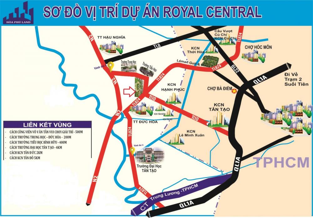 Royal Central tọa lạc tạithị trấn Đức Hòa, Huyện Đức Hòa, tỉnh Long An. Dự án có một vị trí tốt khitiếp giáp đường TL10 và TL 824 (Vành đai 4):