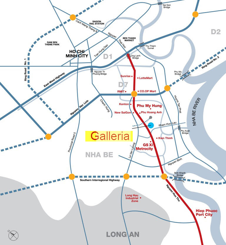 Galleria tọa lạc trên trục đường Nguyễn Hữu Thọ, một trong những trục đường lớn nhất thành phố hiện nay, kết nối Nam Sài Gòn và trung tâm thành phố, Galleria bảo đảm kết nối thông suốt đến Quận 1, Phú Mỹ Hưng và Hiệp Phước.