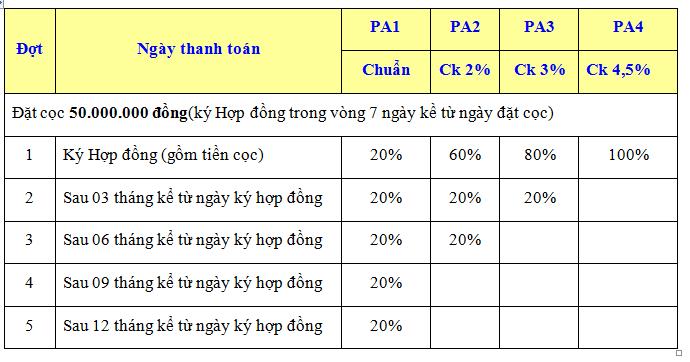- Phương thức thanh toán: Đặt chỗ 50.000.000 đồng/căn