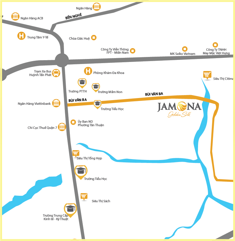 Tọa lạc tại đường Bùi Văn Ba,Quận 7, Jamona Golden Silk kết nối dễ dàng vớitrung tâm quận 1 và khu đô thị cao cấp Phú Mỹ Hưng.Dự án nằmbên cạnh Rạch Bến ngựa yên bình, khu biệt thự ven sông Jamona Golden Silk giốngnhư một điểm sáng về không gian sống lý tưởng.