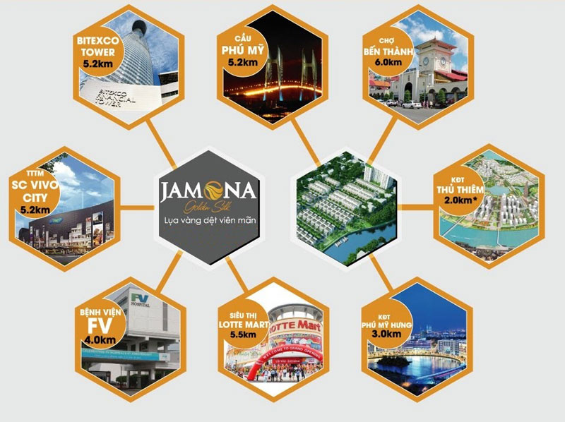 Bên cạnh đó, cư dân củadự án Jamona Golden Silk có thể được thừa hưởng hệ thống tiện ích sẵn có trong khu vực nhưdễ dàng kết nối với trung tâm thành phố chỉ mất 5km, trung tâm hành chính Quận 2 chỉ2km, khu đô thị Phú Mỹ Hưng 3km và cáctiện ích khác trong vòng 5km gồm có: bệnh viện FV, siêu thị Lotte & Co.op Mart, TTTM Crescent Mall, trườngđại học RMIT và nhiều trường học khác... Nhờ vàovị trí thuận lợi này mà cư dânkhông chỉ giải được bài toán về khoảng cách mà còn giúptạo ra giá trị sinh lời vượt trội cho dự án trong tương lai.
