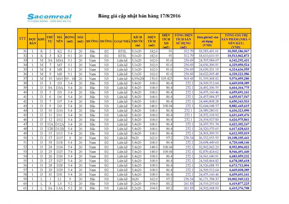 Với mục tiêu trở thành nhà đầu tư phát triển bất động sản hàng đầu Việt Nam, trong thời gian tới, Sacomreal sẽ tiếp tục triển khai các dự án bất động sản với chất lượng môi trường sống cao cùng những tiện ích công cộng như: công viên, trường học, khu trung tâm thương mại.