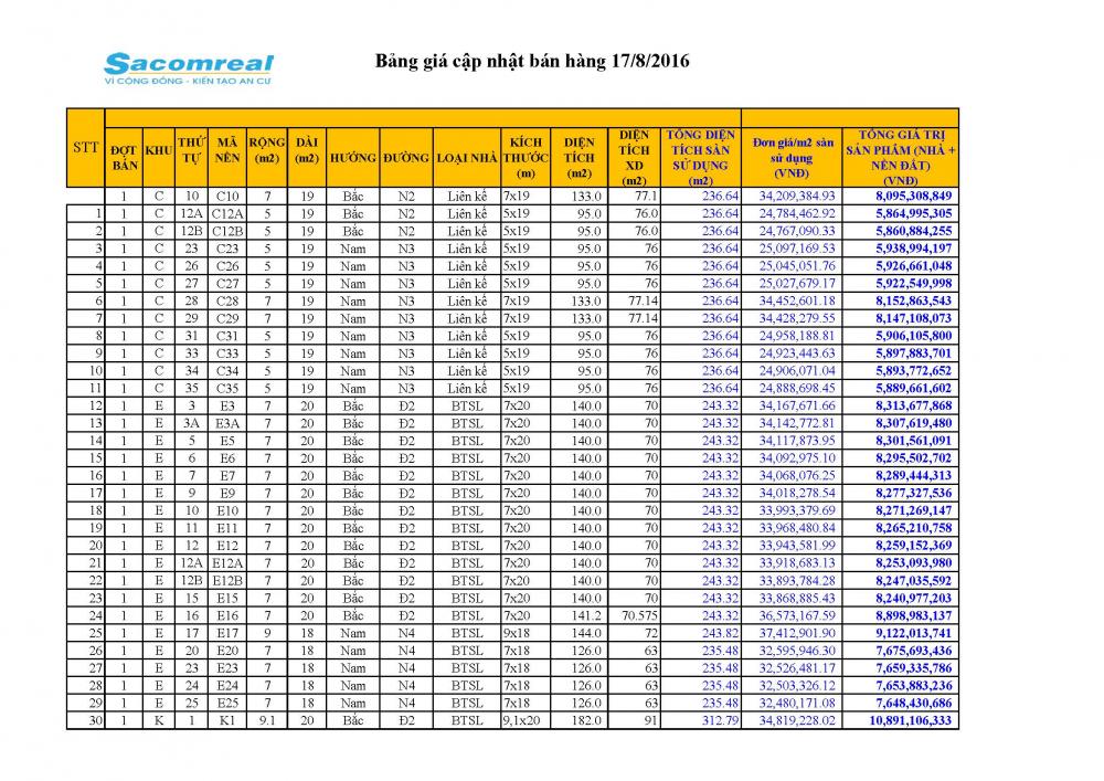 Giá bán biệt thự đơn lập, song lập, nhà liền kề Jamona Golden Silkcập nhật theo bảng dưới đây