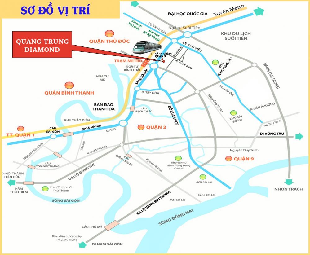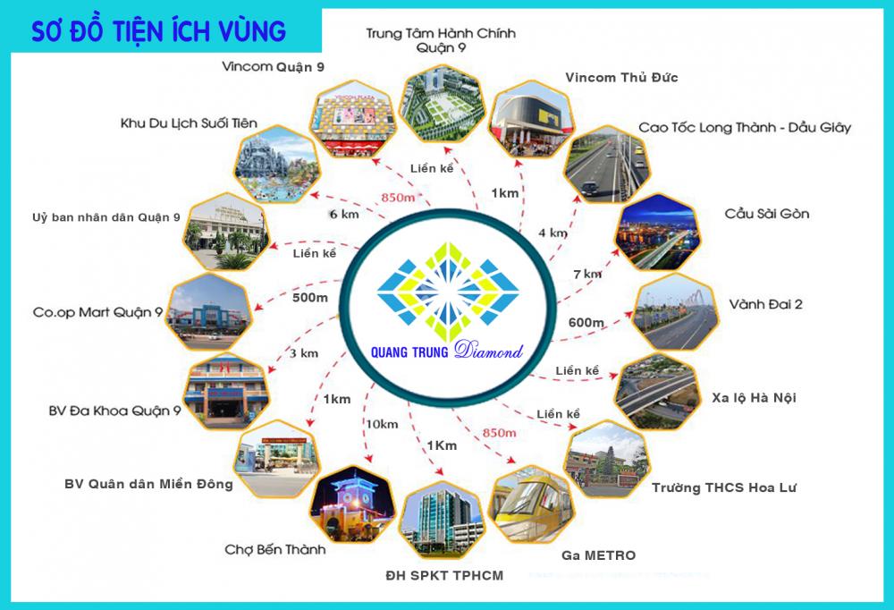 Với vị trí đắc địangay trung tâm quận 9, từQuang Trung Diamond, cư dâncó thể tận hưởng hàng loạttiện ích xung quanh: Khu du lịch Suối Tiên, siêu thịCo.op Mart Quận 9, bến xe Miền Đông (mới), Khu công nghệ cao,Làng Đại học Quốc gia Tp.HCM, ĐH Sư phạm Kỹ Thuật,Vincom Quận 9, Vincom Thủ Đức, Vincom Mega mall, chợ Thủ Đức, Parkson Cantavil,Bệnh viện Quân dân Miền Đông…