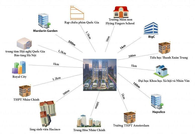 - Trong bán kính 0.5-3km là hệ thống các trường đại học danh tiếng: ĐH KHTN, ĐH KHXH Nhân Văn, HV Bưu Chính Viễn Thông, HV An Ninh,ĐH Kiến Trúc, ĐH Hà Nội