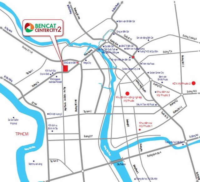 Khu đô thị Bến Cát Center City 2 nằmtại ngã tư đường Hùng Vương và đường Mỹ Phước - An Điền - An Tây, Thị xã Bến Cát, Bình Dương.