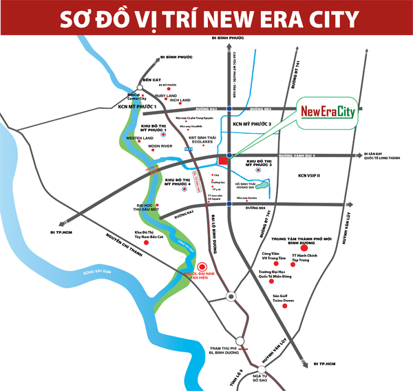 Khu đô thị New Era City nằm ngay giao lộ đường Mỹ Phước Tân Vạn và đường Vành Đai 4 rộng 62m (đi qua 5 tỉnh thành), vị trí tuyệt đẹp ngay Thị Xã Bến Cát.