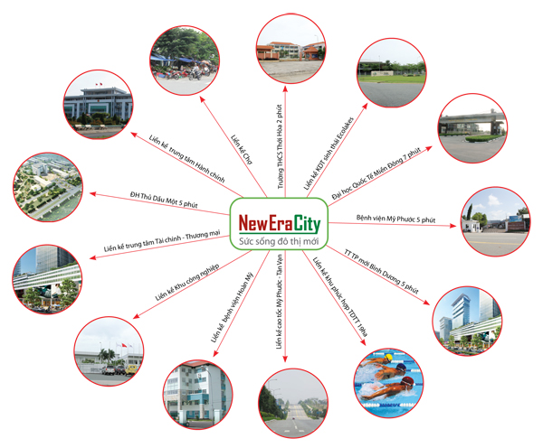 Từ New Era City, bạnchỉ mất khoảng 10 phút để di chuyển đến khu trung tâm TP mới Bình Dương và dễ dàng di chuyển đến các trục đường chính yếu như Quốc lộ 13 nối liền Bình Dương - Tp.HCM - Bình Phước cùng các tỉnh Tây Nguyên.