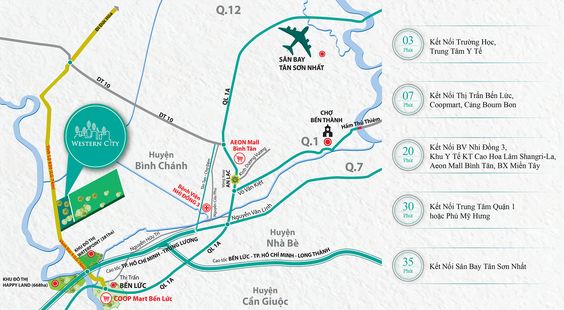 Dự án Western City nằm ngay mặt tiền Tỉnh lộ 830 (thuộc đường Vành Đai 4), huyện Bến Lức, tỉnh Long An. Vị trí nàykết nối trực tiếp đếncao tốc Bến Lức – Long Thành và liền kề cao tốc Tp.HCM - Trung Lương nên việc kết nối đến các vùng lân cận sẽvô cùng thuận lợi.