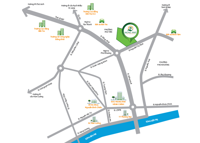 Khu Đô Thị Hưng Phú tọa lạc ngay khu trung tâm nổi bật của TP. Bến Tre với một phong cách sống sang trọng cùng hệ thống tiện ích công cộng hiện đại, hứa hẹn sẽ mang đến cho TP một diện mạo mới, một hình mẫu đẳng cấp cho cuộc sống thượng lưu.