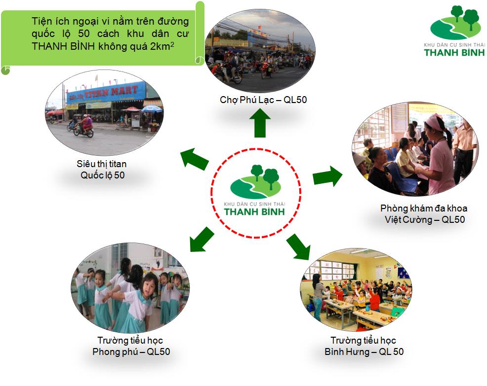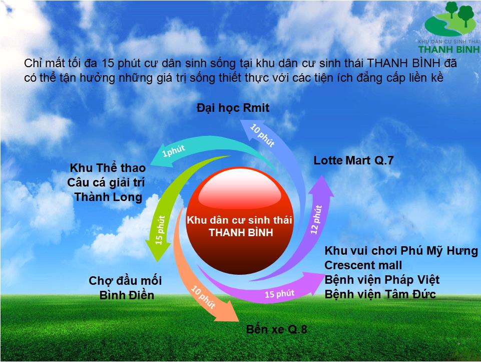 Chỉ mất tối đa 15 phút, cư dân sinh sống tại khu dân cư sinh thái Thanh Bình đã có thể tận hưởng những giá trị sống thiết thực với các tiện ích đẳng cấp liền kề: Đại học Rmit, Lotte Mart Quận 7, Chợ đầu mối Bình Điền, Bệnh viện Pháp Việt, Tâm Đức, Bến xe quận 8,...