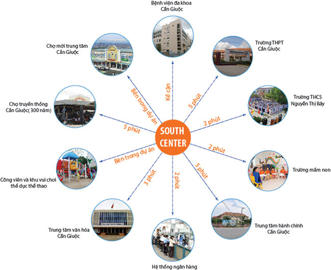 South Center nằm ngay trong lòng thị trấn bên sông Cần Giuộc. Mặt tiền dự án là trục đường chính (lộ giới 30m) nốigiữa Cần Giuộc và Nhà Bè qua phà Cần Giuộc. KĐT South Center cách bệnh viện đa khoa Cần Giuộc 100m cùng các tiện ích khác như trường học, chợ Cần Giuộc cũ trong bán kính 100m.