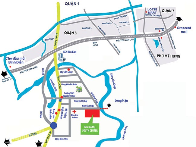 Khu đô thị South Center có vị trí đắc địa, nằm liền kề bệnh viện Đa Khoa Cần Giuộc, ngay bến phà mới Cần Giuộc giúp kết nói huyện Nhà Bè, Quận 7 dễ dàng hơn. Dự án nằm liền kề Cảng công nghiệp Hiệp Phước thuận tiện giao thương - giao thông quốc tế; gần đường Quốc Lộ 50 nối liền các tỉnh miền Tây với Tp.HCM hoặc đường Tỉnh lộ 835 kết nối ngay về Cao Tốc Hồ Chí MinhTrung Lương.