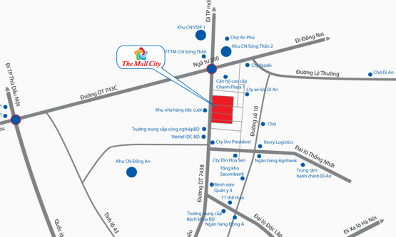 - Tọa lạc gần ngay cổng vào khu công nghiệp Sóng Thần 1, dự án The Mall City có vị trí thương mại đắc địa với mạng lưới giao thông kết nối dễ dàng tới quận Thủ Đức (Tp.HCM), trung tâm Tp.Thủ Dầu Một, Biên Hòa (Đồng Nai).