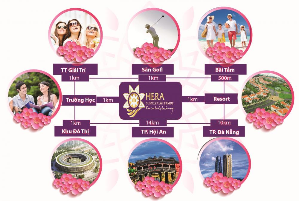 Hera Complex Riverside nằm trên địa bàn phường Điện Ngọc, Điện Bàn, tỉnh Quảng Nam, ngaycon đường biển 5* Đà Nẵng - Hội An, được bao quanh bởi các dự án: Ocean Villas,The Empire,The Nam Hải Resort, Khu Nghĩ dưỡng cao cấp CTX Holding, Resort Sông Hànvà 2 sân golf đẳng cấp Châu Á.