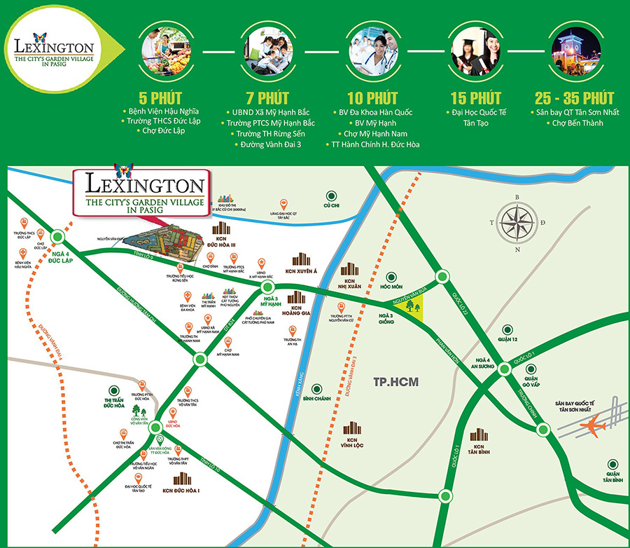 Khu đô thịLexington Garden là dự án hiếm hoisở hữu địa thế siêu đắc địa khi nằm ngaymặt tiền tỉnh lộ 9, huyệnĐức Hòa, Long An - một vị trí vừa sở hữu giao thông thuận lợi vềcác huyện Củ Chi, Hóc Môn,Bình Chánh,… nhưng cũng vừa đủ để mang bạn đến gần hơn với thiên nhiên, tránh xa nhữngồn ào nơi phố thị.