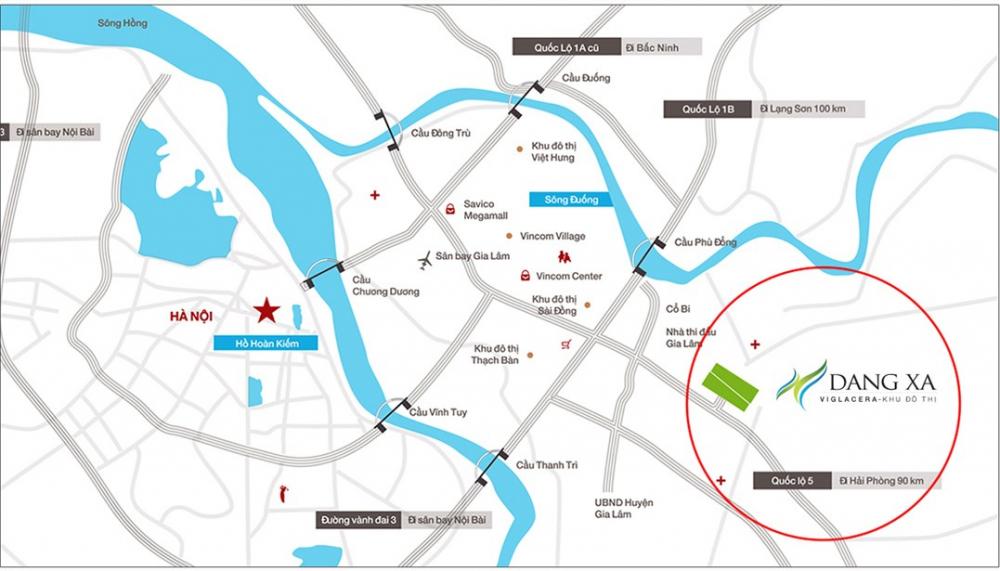 Với các tuyến đường giao thông quan trọng xung quanh rất thuận tiện cho đi lại như quốc lộ 5 đi Hải Phòng, quốc lộ 1 mới đi Lạng Sơn; những cây cầu mới như Cầu Vĩnh Tuy - cách khu đô thị 4km, cầu Thanh Trì - cách khu đô thị 2km, tạo mạng lưới giao thông liên hoàn từ Khu đô thị mới Đặng Xá đến trung tâm Thủ đô Hà Nội.