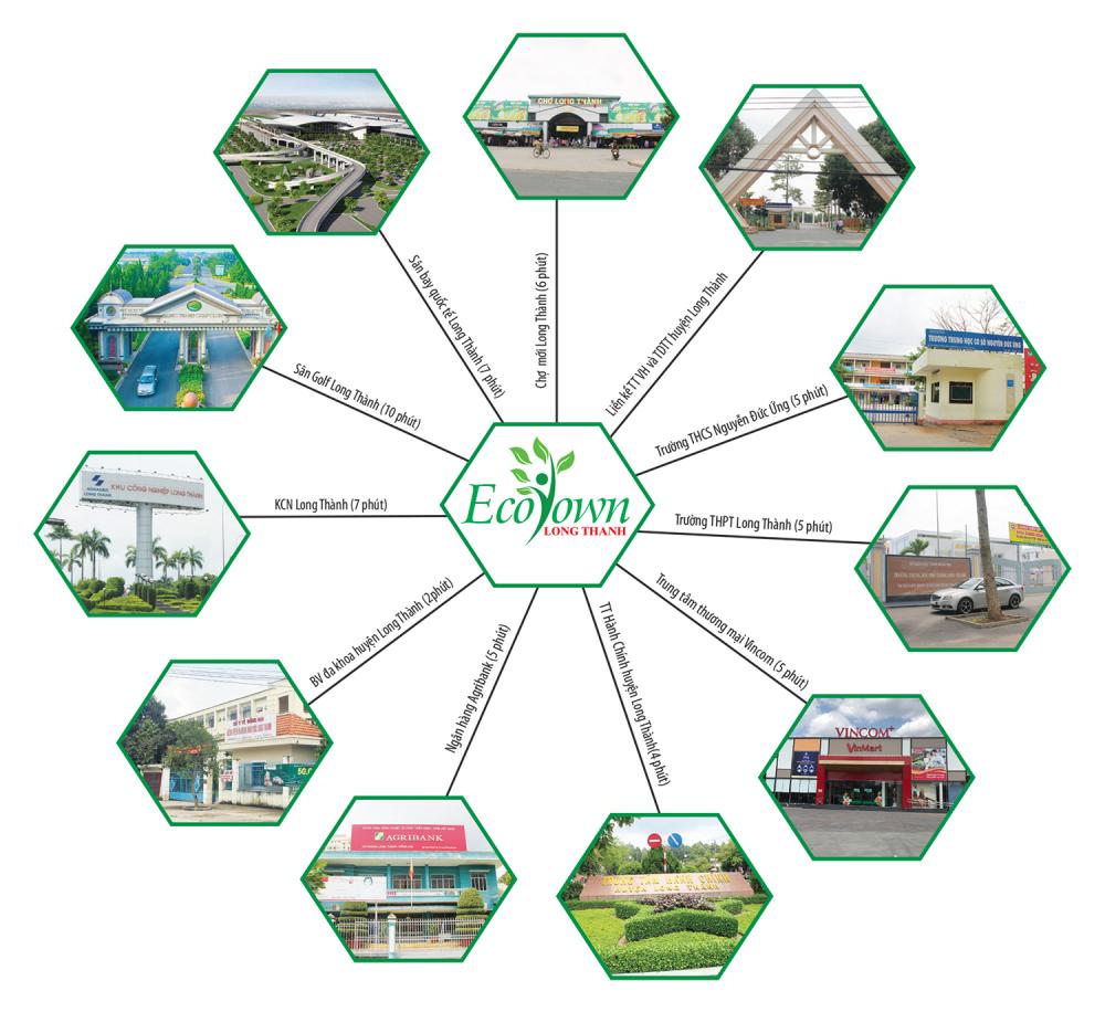 Nhờ tọa lạc ngay trung tâm khu vực phát triển năng động, Eco Town Long Thành được thụ hưởng toàn bộ hệ thống tiện ích hiện đại của đô thị Long Thành. Có thể kể đến một vài tiện ích ngoại khu của dự ánnhư trung tâm hành chính, bệnh viện đa khoa, trung tâm văn hóa thể dục thể thao, trường học, sân golf, chợ, Vincom Plaza,…. Hơn nữa, từ Eco Town Long Thành, cư dâncũng sẽ dễ dàng tiếp cận hệ thống dịch vụ hậu cần đẳng cấp của sân bay quốc tế Long Thành khi dự án này đi vào hoạt động.