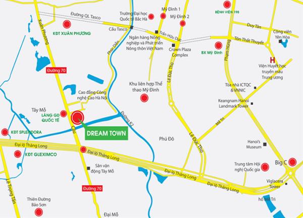 Dự án Dream Town nằm ở vị trí trung tâm, gần trung tâm lớn và vị trí hạ tầng được trang bị đầy đủ. Chung cư gần bệnh viện 198 và 103.